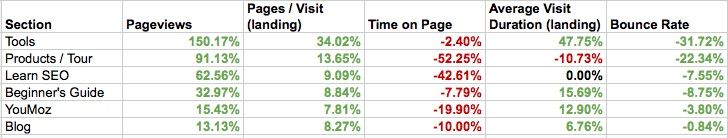 As you can see, nearly every section on the site saw a boost in pageviews and pages per visit, as well as a huge decrease in bounce rate. The only downside is that we did see a decrease in time on page, pretty much across the board. We have a few theories on that: It could be that the more people click around the site, the less qualified each page view becomes; or it could be that the redesign has, in many cases, made pages shorter and easier to read quickly. The fact that time on page has decreased while average visit duration and bounce rate have improved points to the lowered time on page not being an indicator of lower quality, so that’s good.