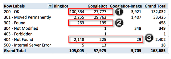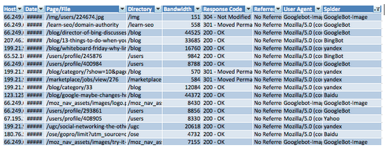 The quickest way to suss out issues that search engines are having with the crawl of your site is to look at the server response codes that are being served. Too many 404s (page not found) can mean that precious crawl resources are being wasted. Massive 302 redirects can point to link equity dead-ends in your site architecture. While Google Webmaster Tools provides some information on such errors, they do not provide a complete picture: LOGS DON’T LIE.