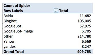 There are no definitive conclusions that we can make from this data, but there are a few things that should be noted for further analysis. First, BingBot is crawling the site at about an 80% more clip. Why? Second, ‘other’ bots account for nearly half of the crawls. Did we miss something in our search of the User Agent field? As for the latter, we can see from a quick glance that most of which is accounting for ‘other’ is RogerBot -- we’ll exclude this.
