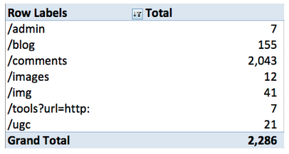 3. Some of the most valuable data that you can get from your server logs are links that are being crawled that resolve in a 404. SEOmoz has done a good job managing these errors and does not have an alarming level of 404s. A quick way to identify potential problems is to isolate 404s by directory. This can be done by running a pivot table with “Directory” as your row label and count of “Directory” in your value field. You’ll get something like: