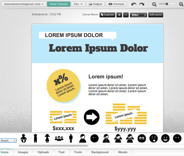 Easel.ly is another free web-based tool for creating infographics. You cannot create graphs using real data with this tool, but its really good for conceptual visualizations and storytelling. It has a beautiful user interface and the themes you can start with are gorgeous. The themes support many common purposes: map, flow-chart, and comparison/relationship graphing. This tool has the best selection of well-design objects (people, a bunch if icons, landmarks, maps, animals, etc.) and backgrounds that I've seen throughout this list of tools. Additionally, you can upload your own images with the free version. You can download a web-quality version as JPG. This tool is still in beta, but it seemed to work pretty well to me!
