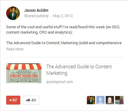 This means the more your Google+ posts are being shared within their social platform, the more high-value links you are able to get (if you've included a link to one of your site's pages within the Google+ post).
