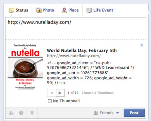 On top of that, your titles and descriptions have to be social friendly. For example, Jennifer from SEOmoz tried to share Nutella Day on Facebook and here is what happened: