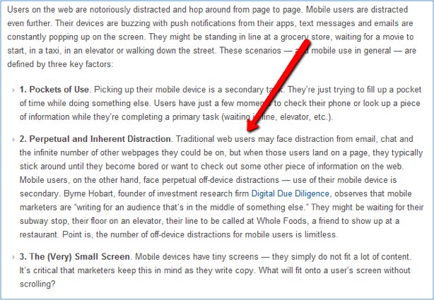 On an article for Optimizing Marketing Copy for Mobile I found these paragraphs intriguing… especially the one with the arrow pointing at it: