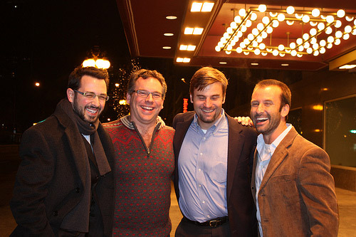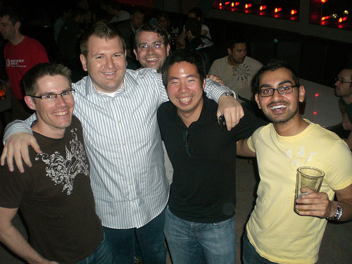 Jon Kelly (Quinstreet), Tony Adam (Billshrink), Andy Liu (BuddyTV) and Neil Patel (Quicksprout) at SEOmoz's annual party after SMX Advanced in Seattle at the Garage (photo-bombing courtesy of Matt Cutts)