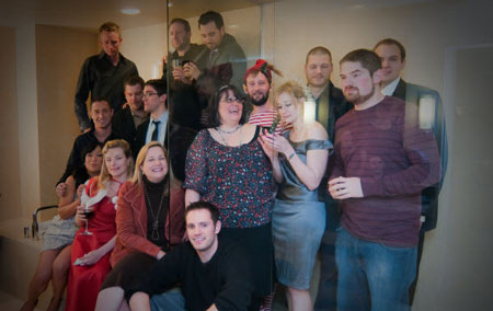 The SEOmoz December holiday party at Olive8 - (Left to Right) Arden, Jimmy, Christine, Sarah, Ben Huff, Timmy, Gillian, Adam, Sam, Jen, Rand, Chas, Kate, Darren, Danny & Nick. Why did we all stuff into the dual showers? Umm... I don't know. It seemed like a good idea at the time. You can watch our holiday video greeting and more holiday party photos on Facebook.
