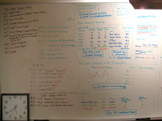 The SEOmoz whiteboards in our conference room, showing off early concepts of new software (codenamed "Turbomoz") we're hoping to launch this coming June
