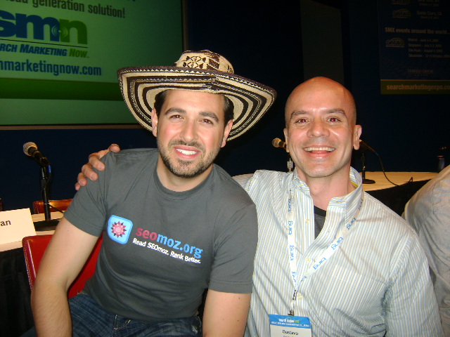 Rand, with a traditional Colombian hat, a gift from Gustavo Parra (at right) pictured at SMX Advanced Seattle