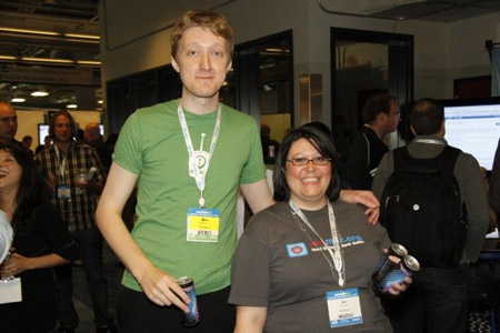 Ben Hendrickson and Jen Lopez, attired in full moz regalia, carrying "link juice" by the SEOmoz booth at SMX Advanced in Seattle