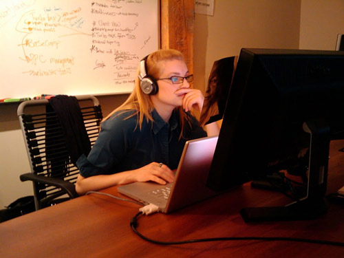 Sarah Bird hard at work in our cramped conference room