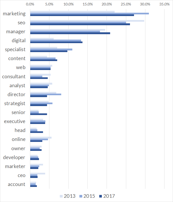 Of note, similar to our results in 2015, the word "marketing" is the most common result, followed by the word "SEO" and the word "manager."