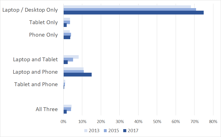 Nearly everyone prefers to read blog posts on a full computer. Only about 15% of folks add their phones into the equation, and the number of people in all the other buckets is extremely small. In 2013, our blog didn't have a responsive design, and was quite difficult to read on mobile devices. We thought that might have had something to do with people's responses -- maybe they were just used to reading our blog on larger screens. The trend in 2015 and this year, though, proves that's not the case. People just prefer reading posts on their computers, plain and simple.