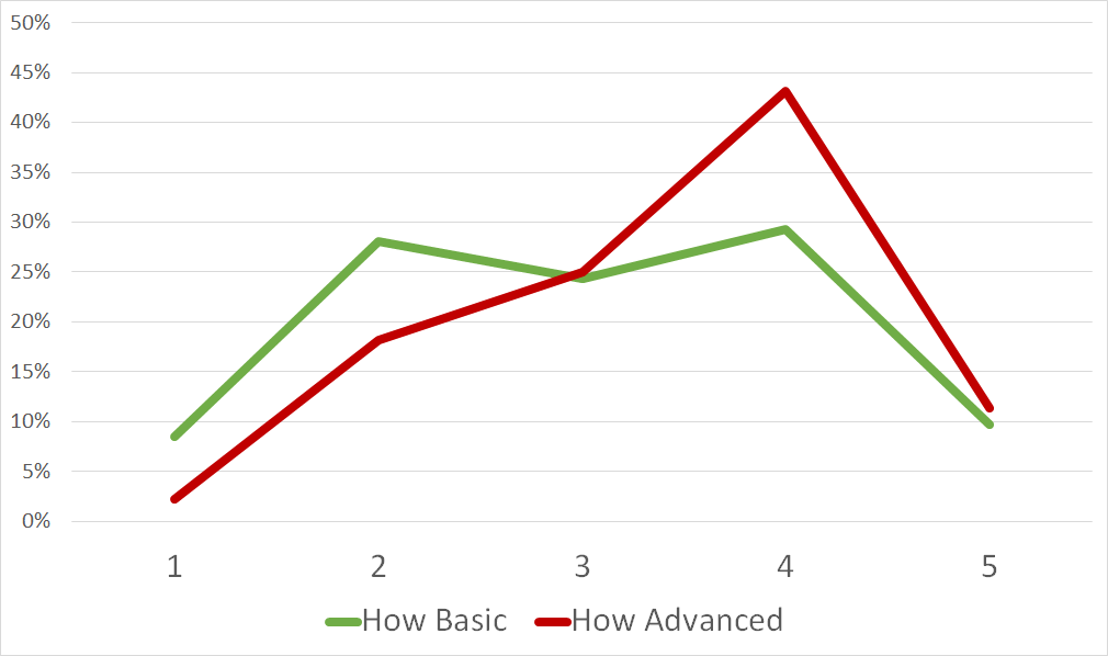 We also asked the people who told us that posts were "too basic" or "too advanced" to what extent they felt that way, using a scale from 1-5 (1 being "just a little bit too basic/advanced" and 5 being "way too basic/advanced." The responses tell us that the people who feel posts are too advanced feel more strongly about that opinion than the people who feel posts are too basic: