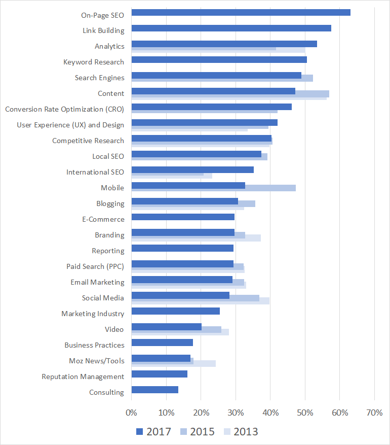 There were very, very few surprises in this list. Lots of interest in on-page SEO and link building, as well as other core tactical areas of SEO. Content, branding, and social media all took dips -- that makes sense, given the fact that we don't usually post about those things anymore, and we've no doubt lost some audience members who were more interested in them as a result. Interestingly, mobile took a sizable dip, too. I'd be really curious to know what people think about why that is. My best guess is that with the mobile-first indexing from Google and with responsive designs having become so commonplace, there isn't as much of a need as there once was to think of mobile much differently than there was a couple of years ago. Also of note: When we did this survey in 2015, Google had recently rolled out its "Mobile-Friendly Update," not-so-affectionately referred to by many in the industry as Mobilegeddon. So... it was on our minds. =)