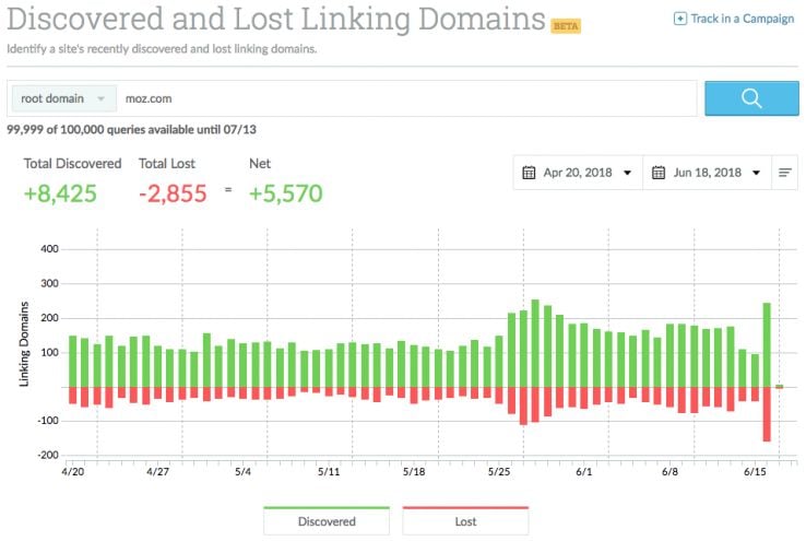 Link Explorer addresses and improves upon its predecessor by providing more data, fresher data, and better ways to visualize that data. Answering a long-asked-for feature in OSE, Link Explorer includes historical metrics, and it also surfaces newly discovered and lost links: