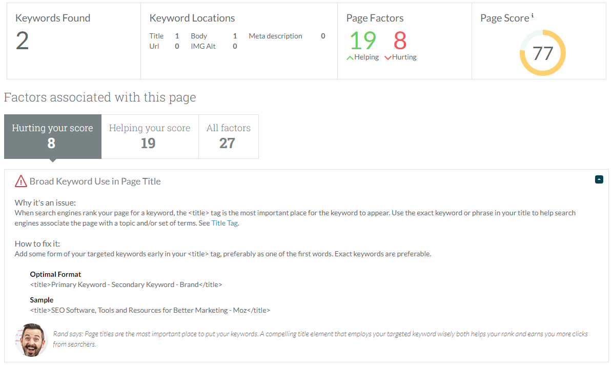 - On-page factors are now categorized so you can see what is hurting or helping your Page Score.
