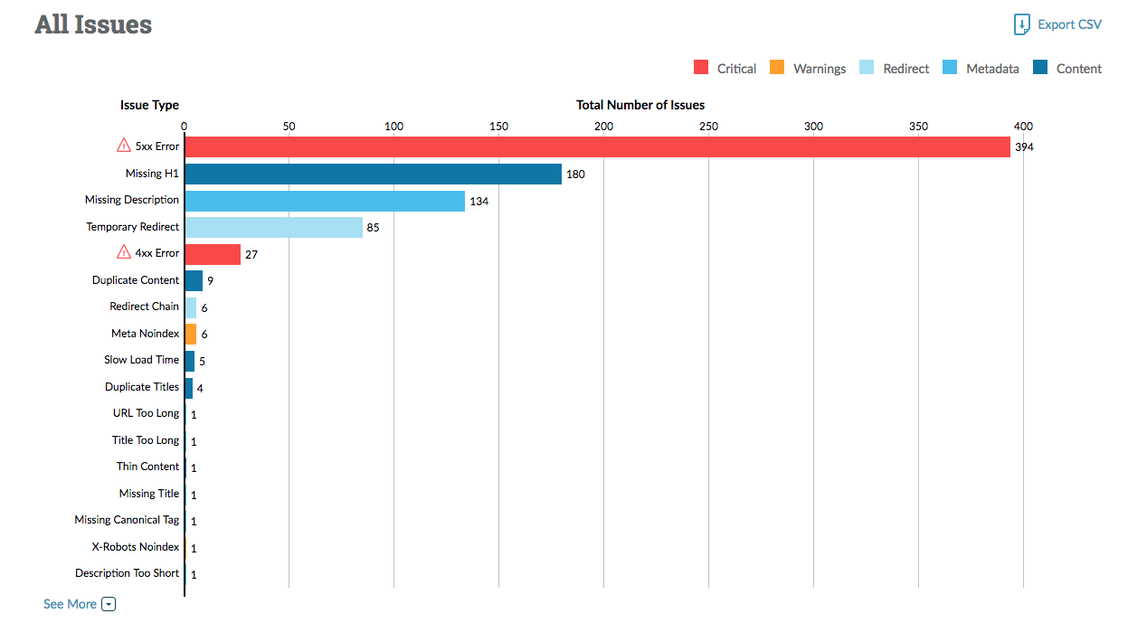 - Your site issues are now categorized by issue type and quantity, making it easier to identify what to work on and how to prioritize: