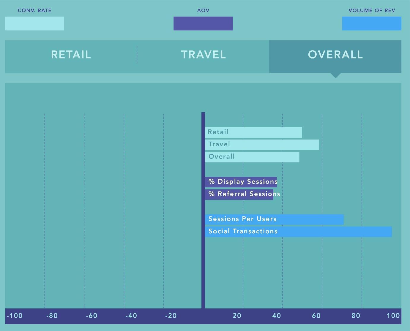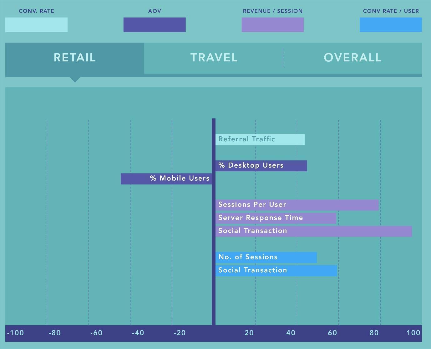 In other words, the core role of the marketer is to create an elegant journey across touchpoints to deliver a person from two click prospect to five click purchaser. Any activity which increases sessions per visitor will increase conversion. Similar to last year’s report, another of the strongest and most consistent correlations was the number of Sessions per User (0.7) — which emphasizes the importance of this metric.