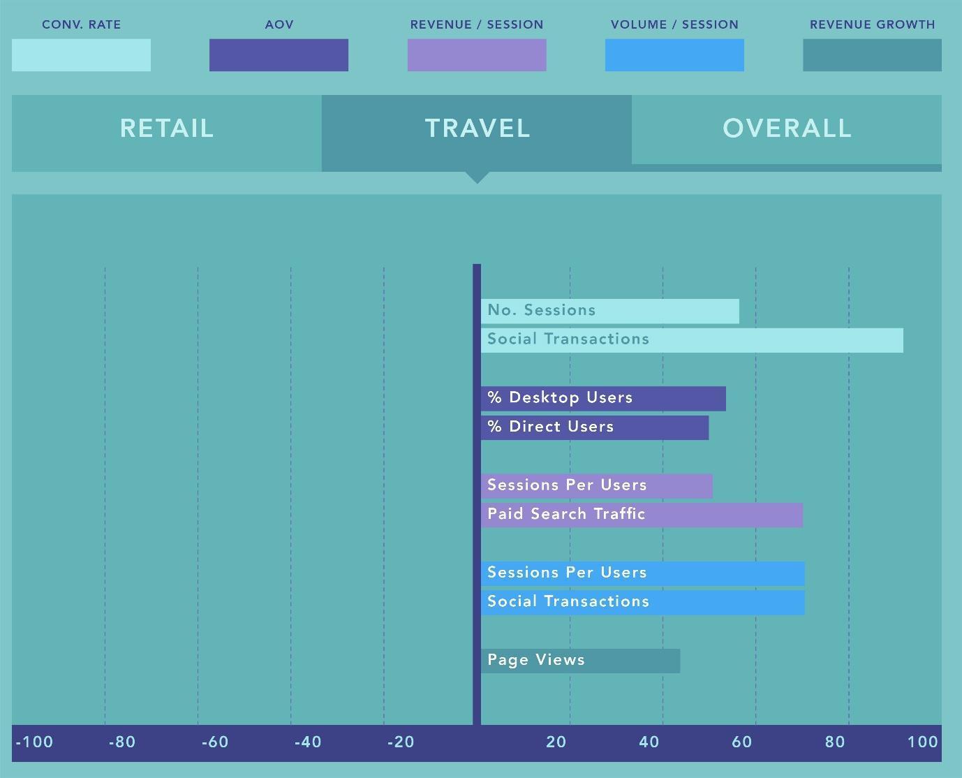 Every budding business student knows that when volume increases, cost per unit decreases. It’s called economies of scale. But what do you call it when it’s revenue per unit that’s increasing with volume? At Wolfgang, we call it efficiencies of scale. Similar to last year’s report, one of the strongest correlations against a number of the success metrics was simply the number of sessions. More visitors to the site equals a higher conversion rate per user (0.49). This stat summons the final wag for the long-tail of smaller specialist retailers. This finding is consistent across both the retail and travel sectors.