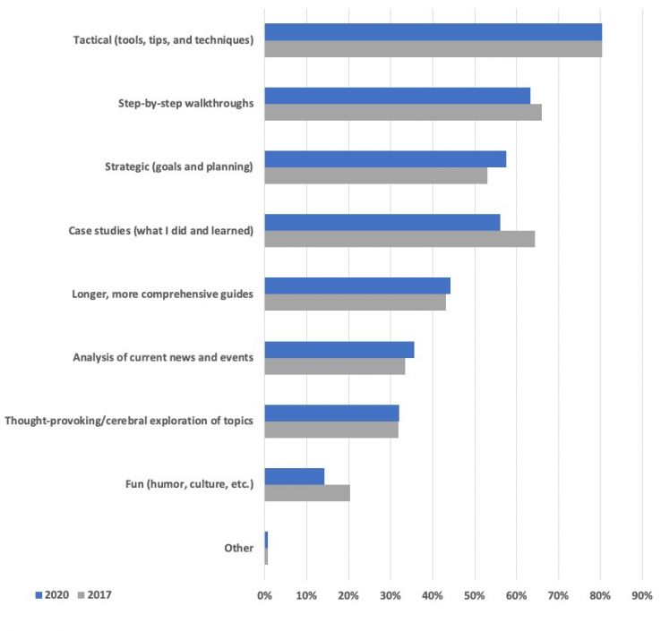 The way readers want to consume those topics hasn't changed much at all in the last three years — the desire for actionable, tactical insights is as strong as ever, with the request for tools, tips, and techniques remaining at 80% of respondents. These types of posts have been and will remain our go-to moving forward.