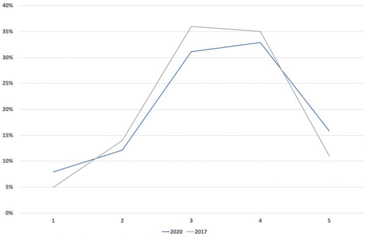 While the trends regarding readers' opinions on relevancy remained similar between 2017 and 2020, we saw about a 6% dip in respondents who said 81-90% of posts are relevant to them, and increases in the bottom four percentage brackets. These results, paired with the topic requests we'll cover later, indicate a need to shift and slightly narrow our content strategy to include more posts specific to core SEO disciplines, like on-page SEO and analytics.