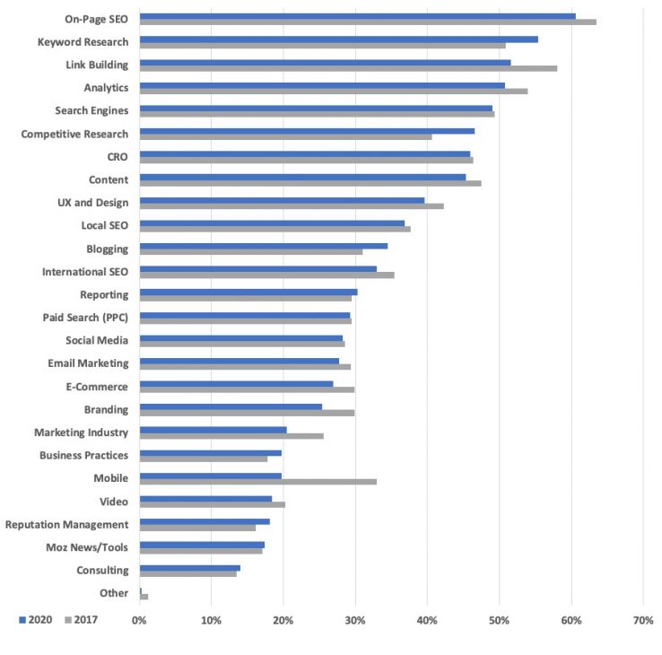 Survey respondents could choose multiple topics from the list below in their answers, and the most-requested topics look very similar to 2017. A noticeable shift is in the desire for mobile SEO content, which dropped from being requested in 33% of responses in 2017 to just under 20% in 2020.