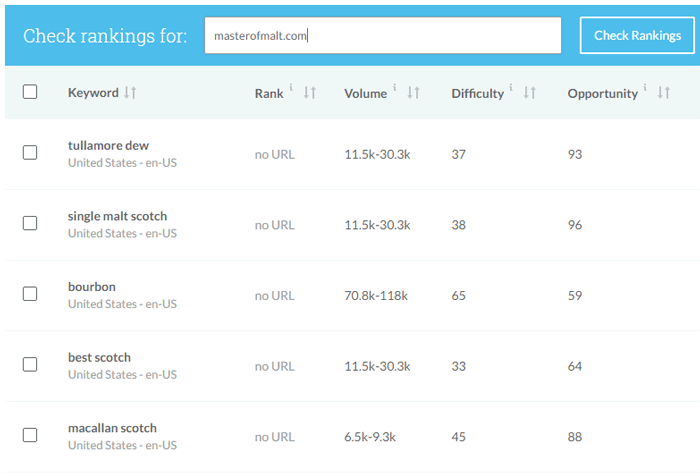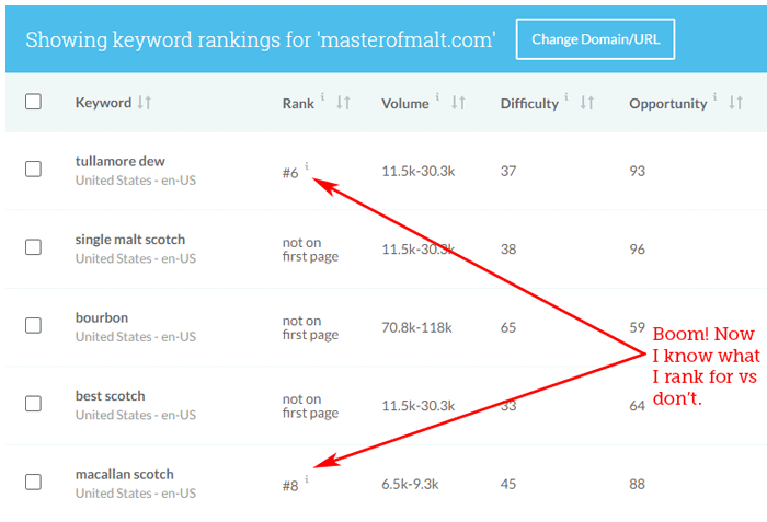 First on the list is the ability to easily see whether a given domain (or URL) already ranks on page 1 for any of the keywords on a list. Just enter a domain or page, hit "check rankings," and the Rank column will fill in with your data.