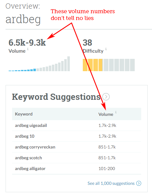 * In the English-language market, that is; outside of the United States, Canada, the United Kingdom, and Australia (where we get Jumpshot and other clickstream data), the suggestions aren't as comprehensive and the volume numbers are often missing. Sadly, it'll probably be this way for a while as we're focusing on English markets for the time being, and will need to find and make deals with clickstream providers in each country/language in order to match up.