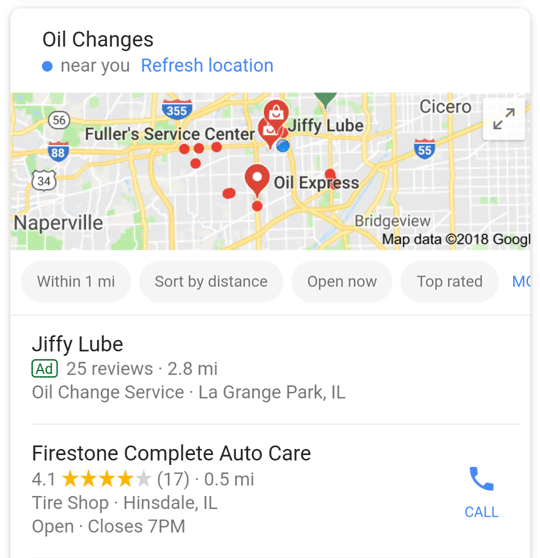Over the past year, you may have spotted a new kind of Google ad on a local search. It looks something like this one (on a search for "oil change" from my Pixel phone in the Chicago suburbs):