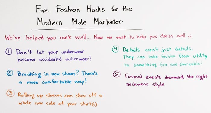 Rand: Howdy gang, and welcome to a very special Whiteboard video on men's fashion. Well, so it turns out of all things that, in addition to my deep, deep passion around search and social media and content marketing and all things inbound, I'm also particularly passionate about what guys wear. I hope that I can be helpful in upgrading some of the things that we all wear, because as an industry, occasionally I will go to a conference or an event or someone's office and see things that make me scratch my head and wonder whether women or men, who might be interested in these men, also scratch their head.