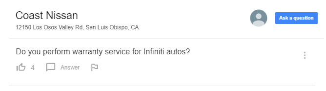 It looks like Coast Nissan has a customer who is ready to walk through the door if they receive an answer. But as you can see, the question has gone unanswered. Note, too, that four people have thumbed the question up, which signifies a shared interest in a potential answer, but it’s still not making it onto the radar of this particular dealership.