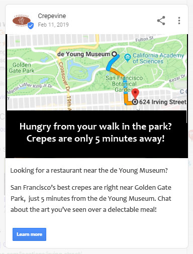 Imagine someone has just spent the morning at a museum, a landmark, park, or theatre. After exploring, perhaps they want to go to lunch, go apparel shopping, find a gas station, or a bookstore near them. A well-positioned Google Post, like the one below, can guide them right to your client’s door: