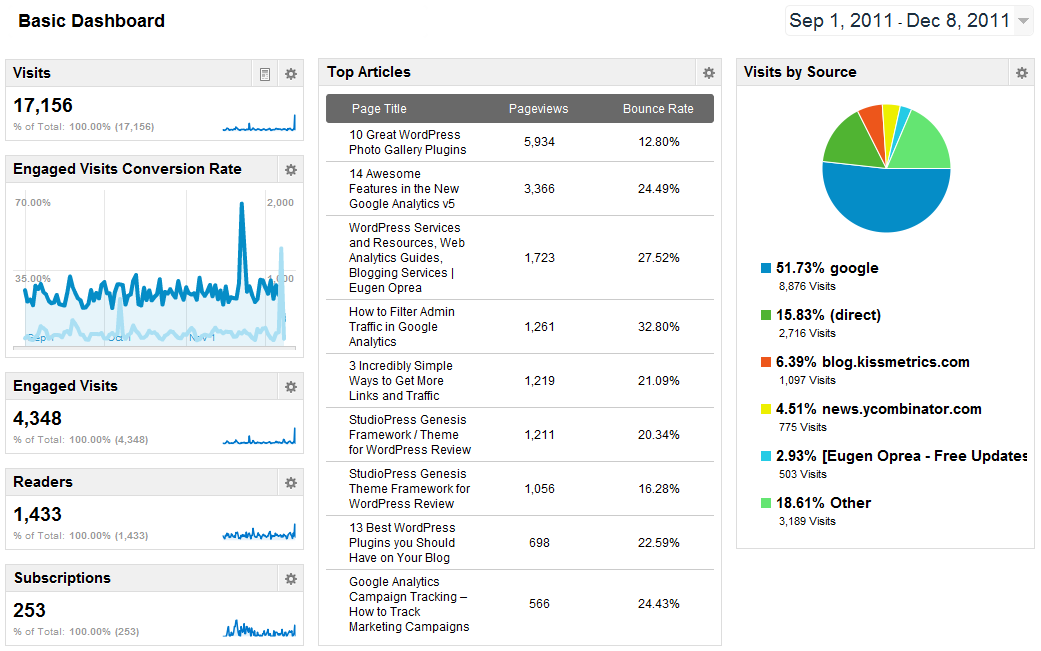 The first dashboard tells you at a glance how your site is performing in therms of visitors, how many times the visitors have completed your goals, what are your conversion rates, what content gets the most visits and who sends traffic to your website.