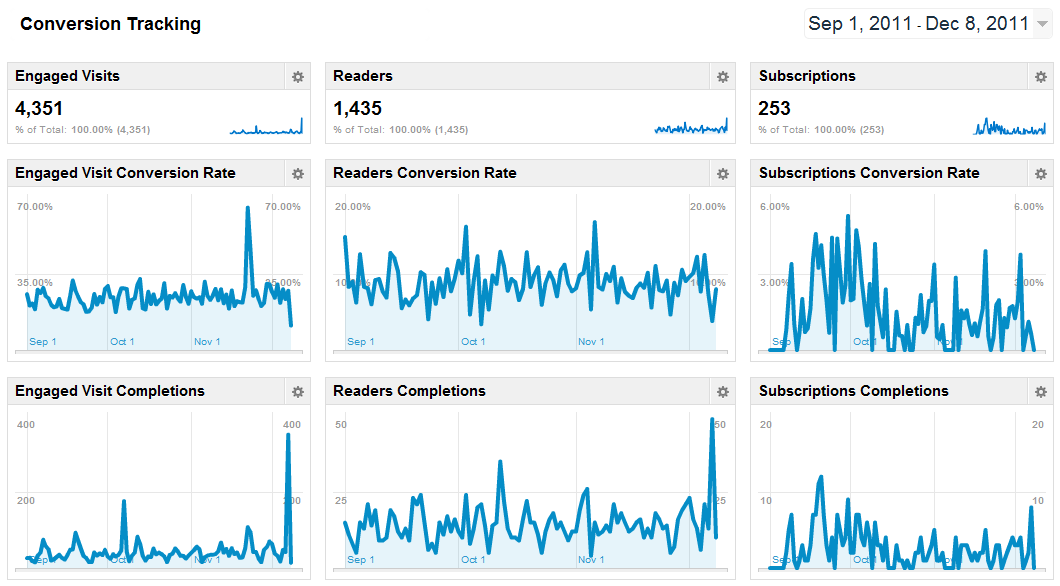 Once you check the overviews, it's time to dive more into data and check specifics for each section. The most important details for you should be conversion rates and details about how visitors convert in engaged visitors, readers and subscribers over different periods of time. And not only the conversion rates, but also the numbers of visitors that converted, so you can keep tabs on how your content engages visitors and how your subscribers list grows.