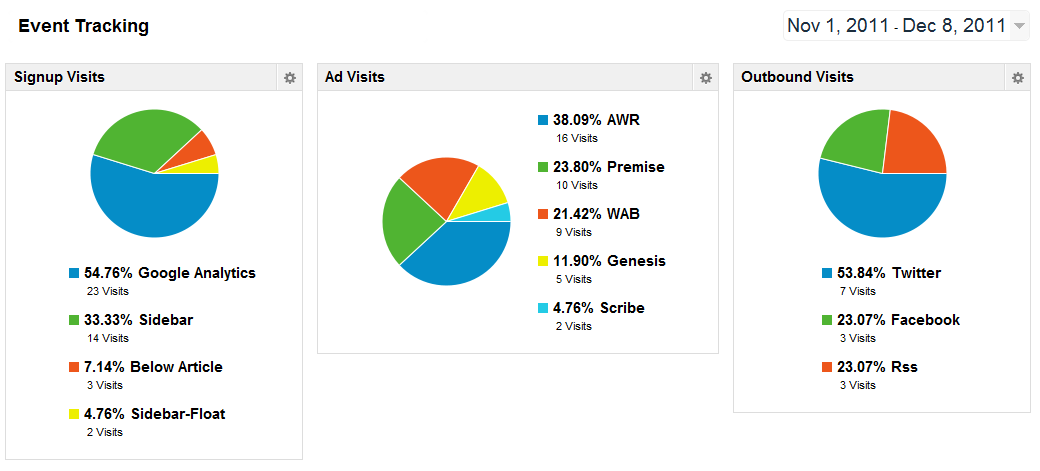 Next, if you do not use event tracking already, you should look at its benefits and try to implement it. This example might be tailored just for me, because I use event tracking to see how many visitors click on my ads and which signup form they use to subscribe to newsletter. I consider it insightful because it helps me see how each of them performs. That is why I use pie charts to see how each of them performs compared to each other.