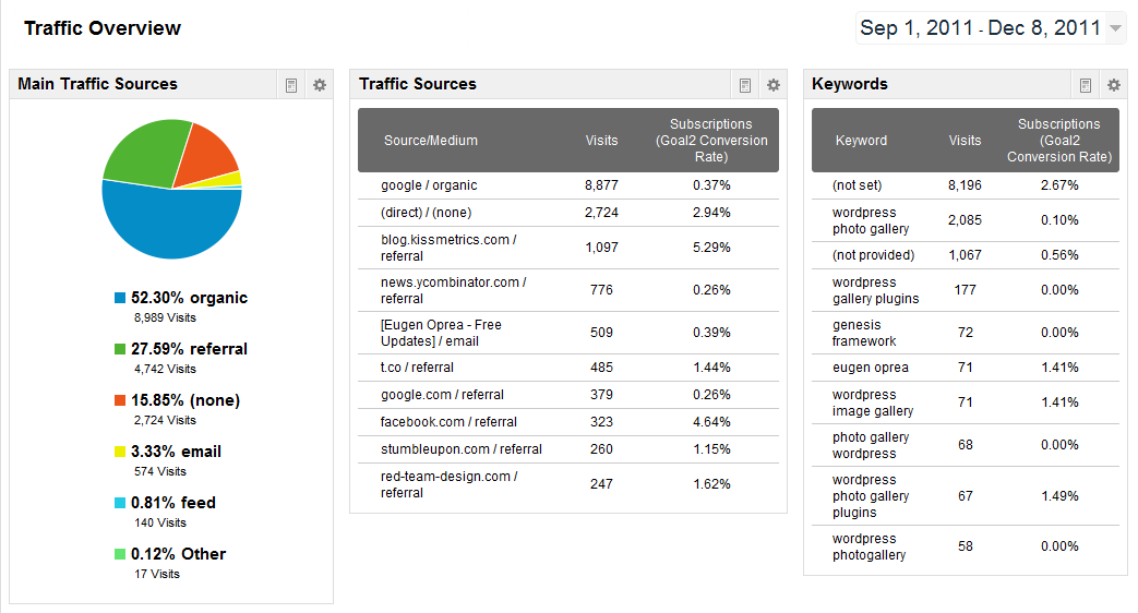 Finally, you will interested to know how your traffic is broken down and what are the main sources that send you visitors so you can keep the level between organic, referrals, direct and campaigns traffic balanced.