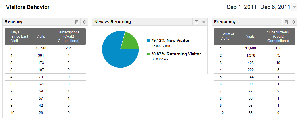 The Visitors Behavior dashboard will help you see the recency of your visitors, how many days passed since they last visited, what is the percentage of new vs returning visitors and how frequent they visit your site. Additionally, you can also add there one of your goals and track goal completions or conversion rates.