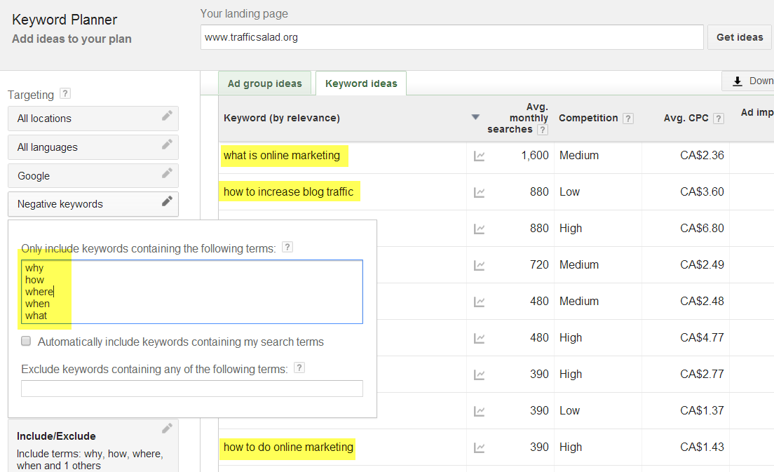 It's cool how Google knows which keywords and ad group ideas are relevant for a site. I will then start blogging about these keywords if my site has no content that matches it.