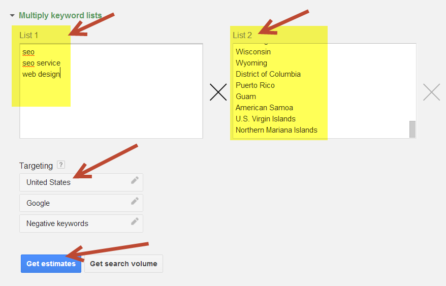 If you are doing local SEO, then you'll love this strategy. Add your main topics or keywords in the List 1 column, then add geographic locations (cities or states) in the List 2 column.