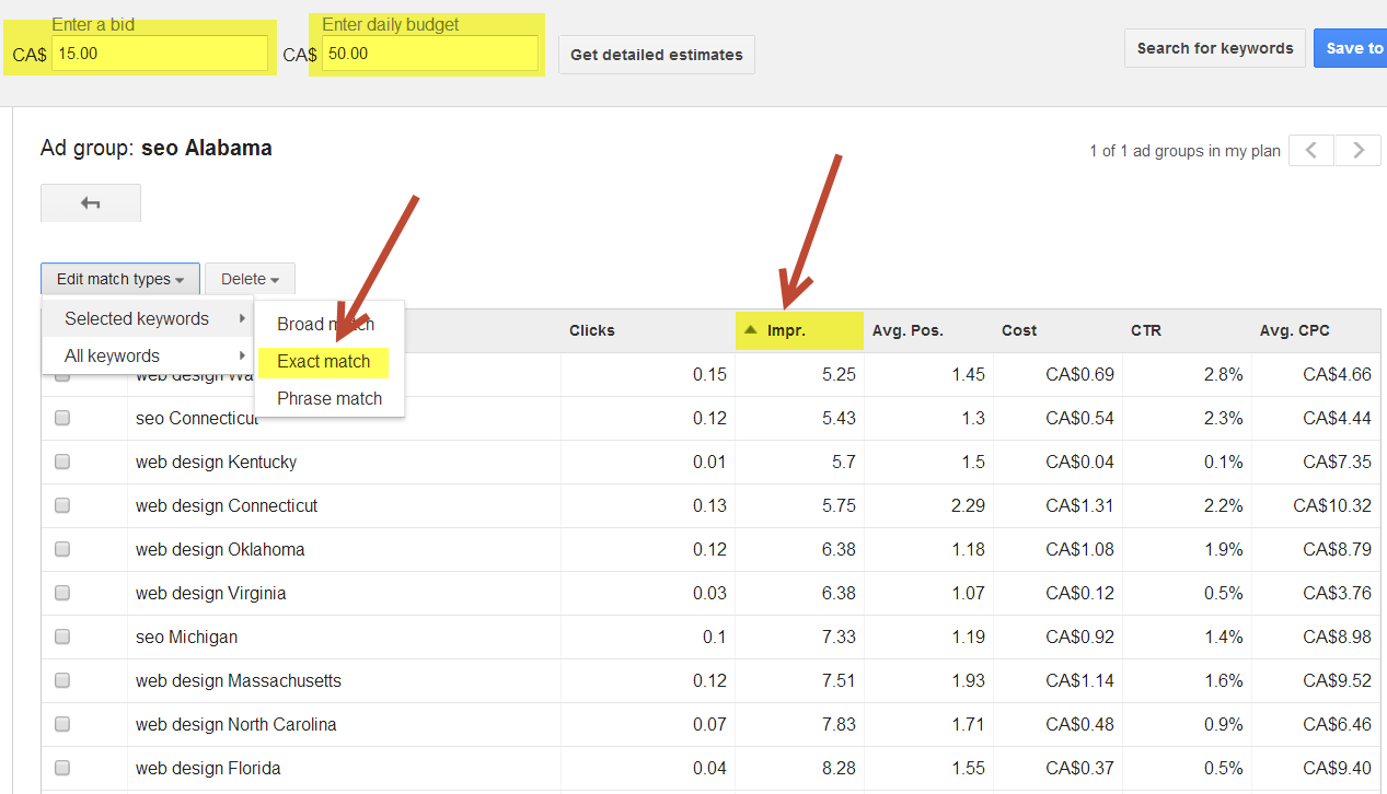 *You can also edit the match types to "exact match" and click on the impressions to sort out keywords with the highest traffic potential.