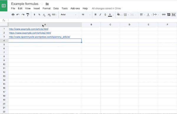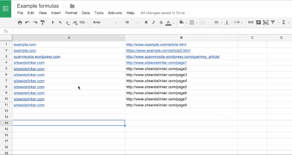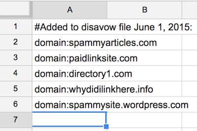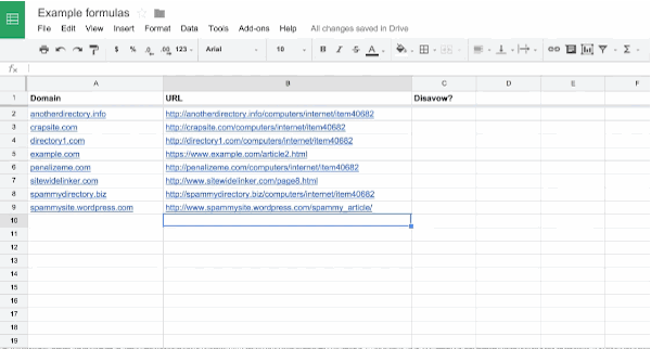 - Copy and paste column A from your disavow spreadsheet onto this new sheet. Or, alternatively, use the import function to import the entire CSV onto this sheet.