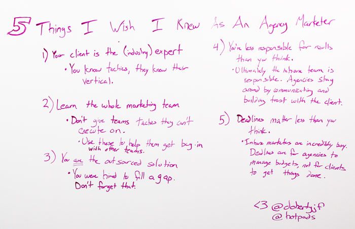 Working as an agency marketer is tough. I did it for a bit over two years and learned a lot of lessons. Along the way and since I have reflected about what would make me more successful as an agency marketer, and now that I am in-house at HotPads.com, I've come up with five things I wish I had known as an agency marketer. Never fear though, as there are some tidbits in there for the in-house crew as well!