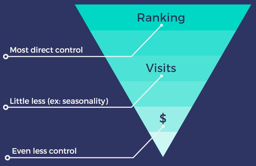 First of all, SEO is a few layers removed from conversions. When it comes to “the big three” (as I like to refer to rankings, traffic, and conversions), SEOs can: