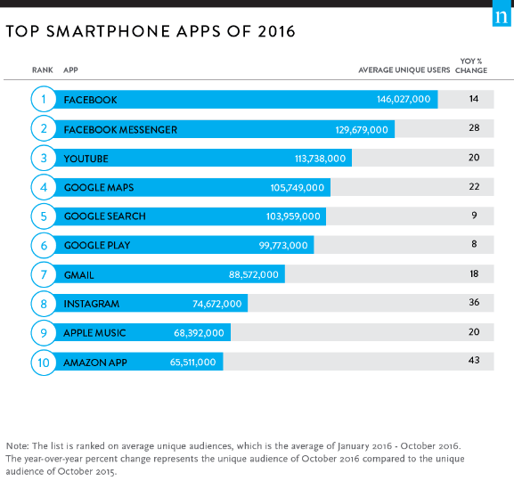 Nielsen reported that Amazon broke into the top 10 this year, but apart from that, it's been fairly quiet in the rankings shakeups at the head of the app curve. What's scarier is that Google and Facebook own a full 8 of the top 10 apps, and those apps are responsible for more than 90% of all app activity.