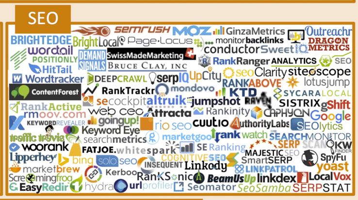 But, oddly enough, SEO has always remained a small player in the software world. The vast majority of the companies and tools in the list below are private, unfunded, and have annual revenues of <$1mm. A few larger players exist, but in every other marketing tech category, there's at least one player at 2–10X the size of our entire market combined.