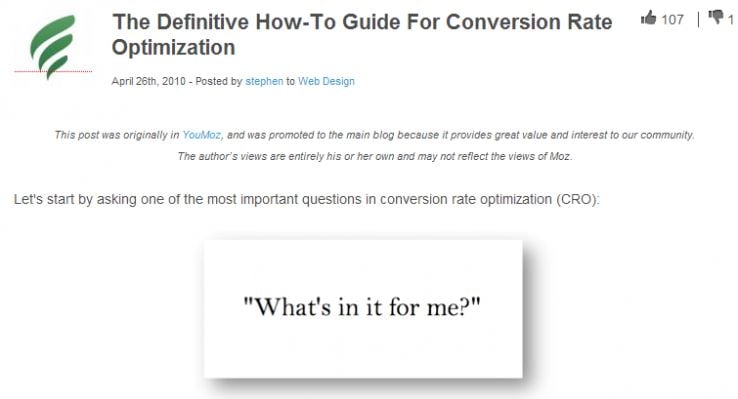 Lesson: Could you launch your content where your target market is? A great example of this happening in the SEO community is Stephen Pavlovich's Definitive Guide To Conversion Rate Optimisation. It's a fantastic piece of content that was launched on Moz and helped to build Stephen's name in the industry.