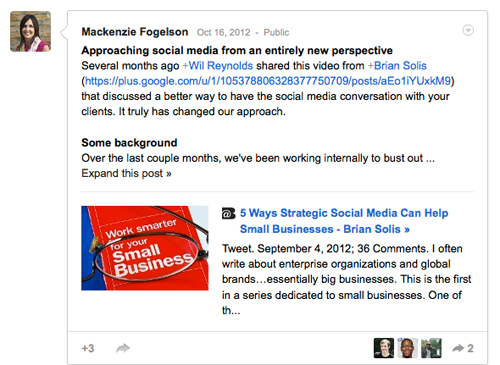 Google+ is not Twitter or Facebook or LinkedIn. When you post the content here (same goes for any social outlet), you need to have a different approach. Use yet another unique teaser that is different than what you’ve used for all of the other outlets.