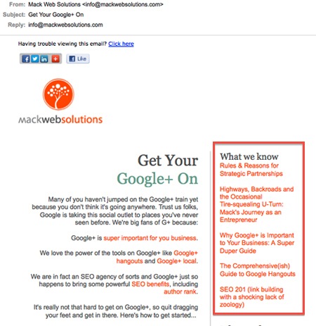 Note: Feature just the one piece of content that you’re marketing. That’s right, just that one. If you have other great content that people might want to read (or that you want to draw their attention to), you can include it in a dedicated column in the email template (just like on your blog). You’ll find that you’ll get some additional click throughs to other valuable stuff on your site.