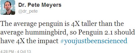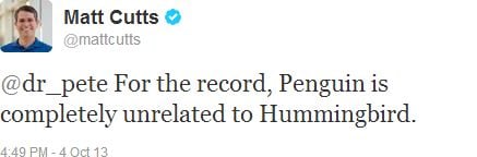 Matt's concern that even my painfully stupid joke could be misinterpreted demonstrates just how confused many people are about the algorithm. This tweet actually led to a handful of very productive conversations, including one with Danny Sullivan about the nature of Google's "Hummingbird" update.
