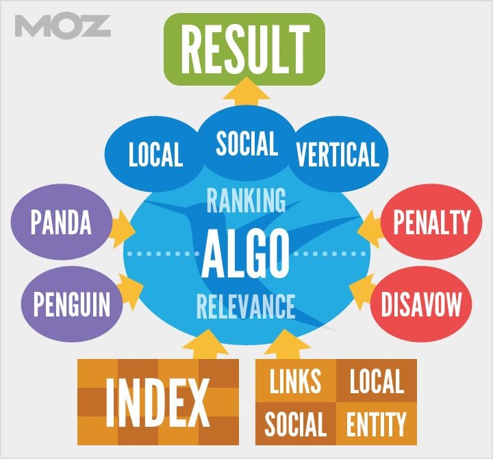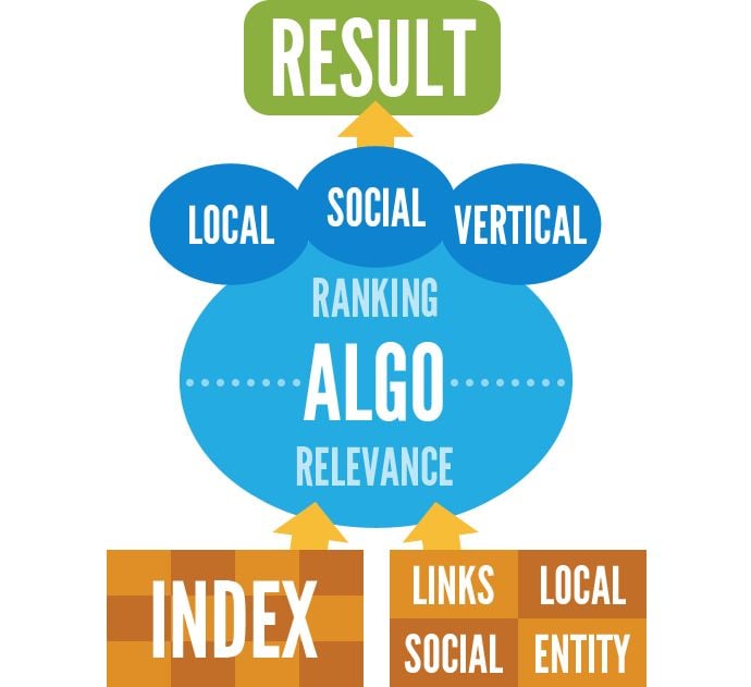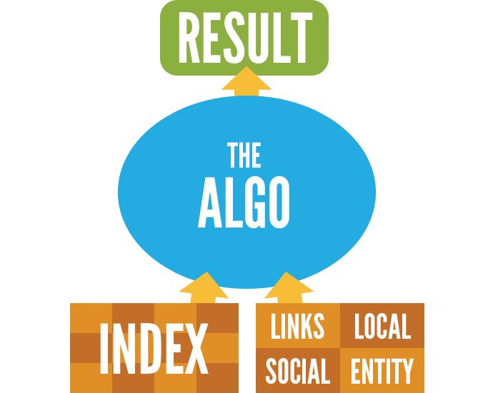 For the purposes of this post, I'm going to leave out personalization, which has its own inputs (like your search history and location). Personalization is undoubtedly important, but it impacts many areas of this illustration and is more of a layer than a single piece of the puzzle.